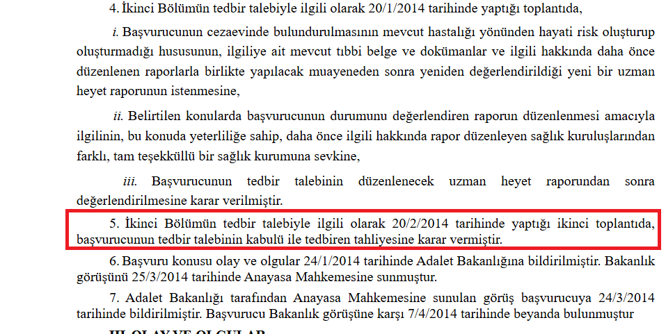 Nitekim Anayasa Mahkemesi 17. maddenin ihlalinden kaynaklı şikayetle ilgili verdiği Fatih Hilmioğlu [[2. B.], B. No: 2014/648, 18/9/2014, § 4] kararında; TEDBİREN BAŞVURCUNUN TAHLİYESİNE karar vermiştir: